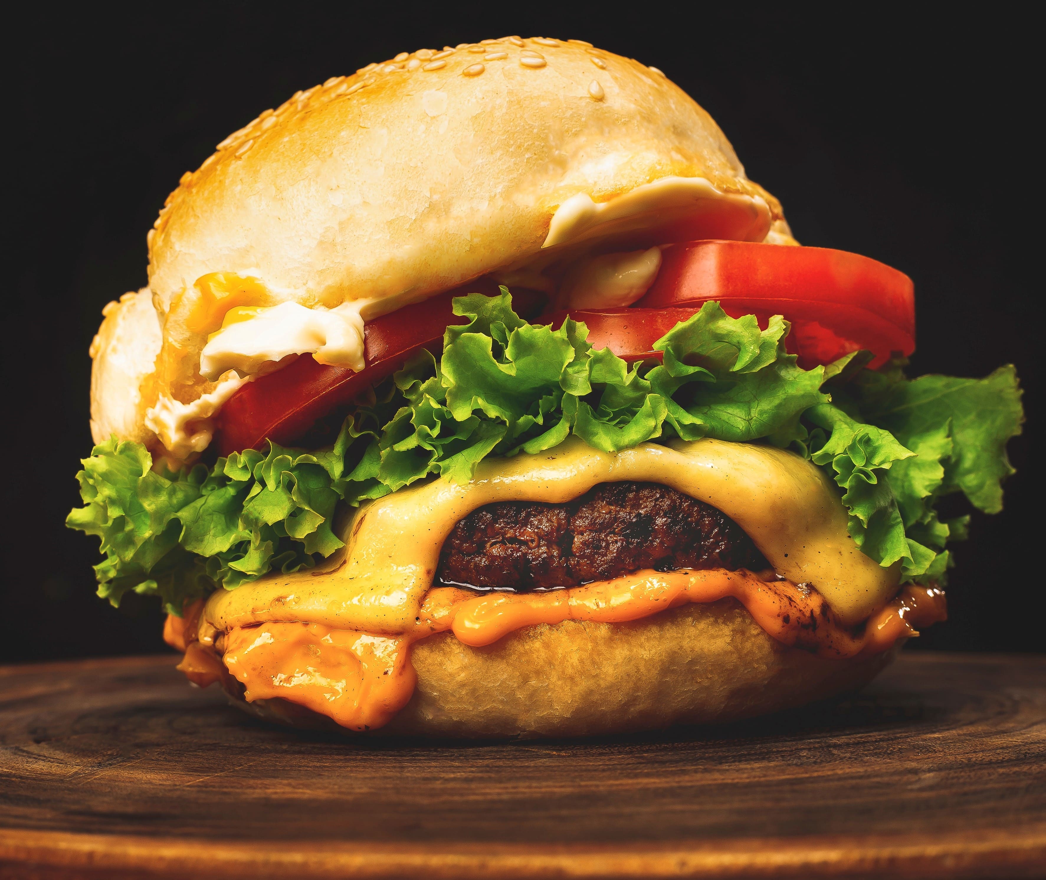A hamburger (also burger for short) is a food, typically considered a sandwich, consisting of one or more cooked patties of ground meat, usually beef, placed inside a sliced bread roll or bun.